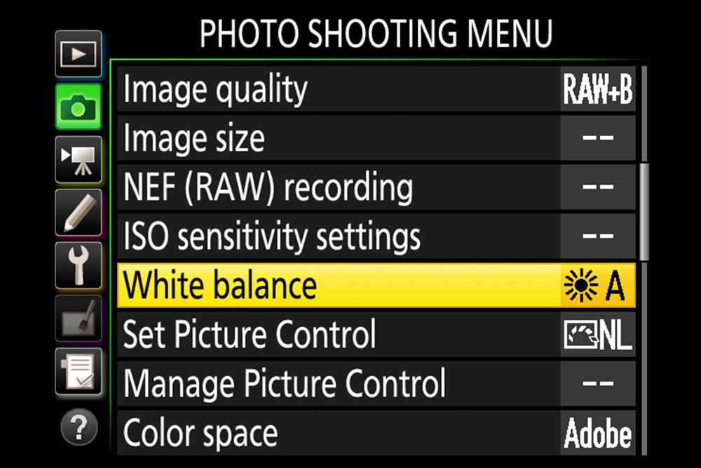 Примечание: Обратитесь к руководству пользователя, если вам понадобится помощь с поиском меню баланса белого. У большинства моделей камер также есть соответствующая кнопка на верхней или задней части корпуса.
