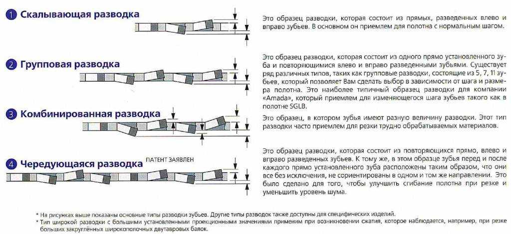 Величина разводки ленточных пил зависит от размеров заготовки, вида металла, его прочностных характеристик. При разрезании сплошного металла больших размеров заготовки применяется чередование узкой и широкой разводки зубьев, чтобы избежать эффекта защемления пилы.