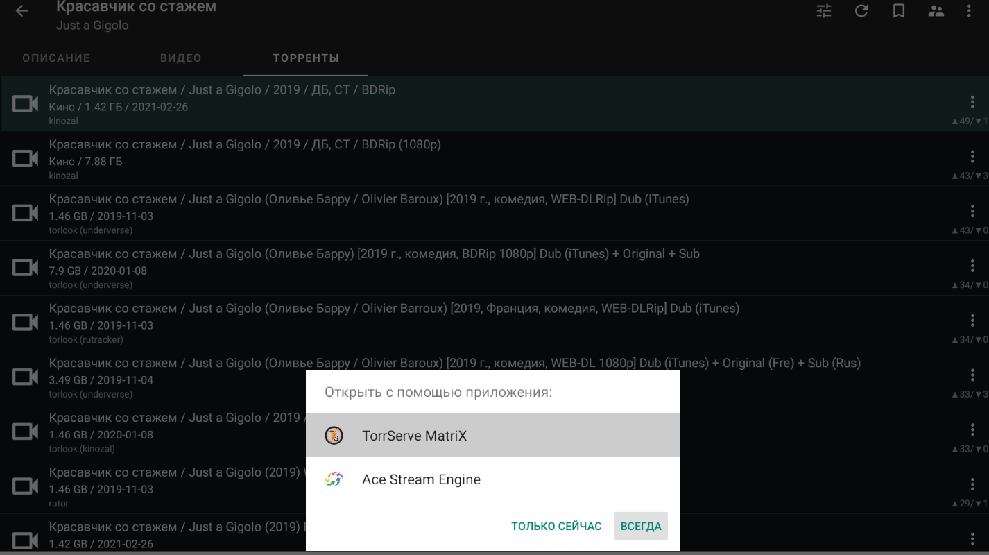 Проверяем работу во всех приложениях, которые показывают торренты. Выбираем по умолчания для воспроизведения торрентов TorrServe Matrix, если при первом запуске спросит, то ставим Всегда.