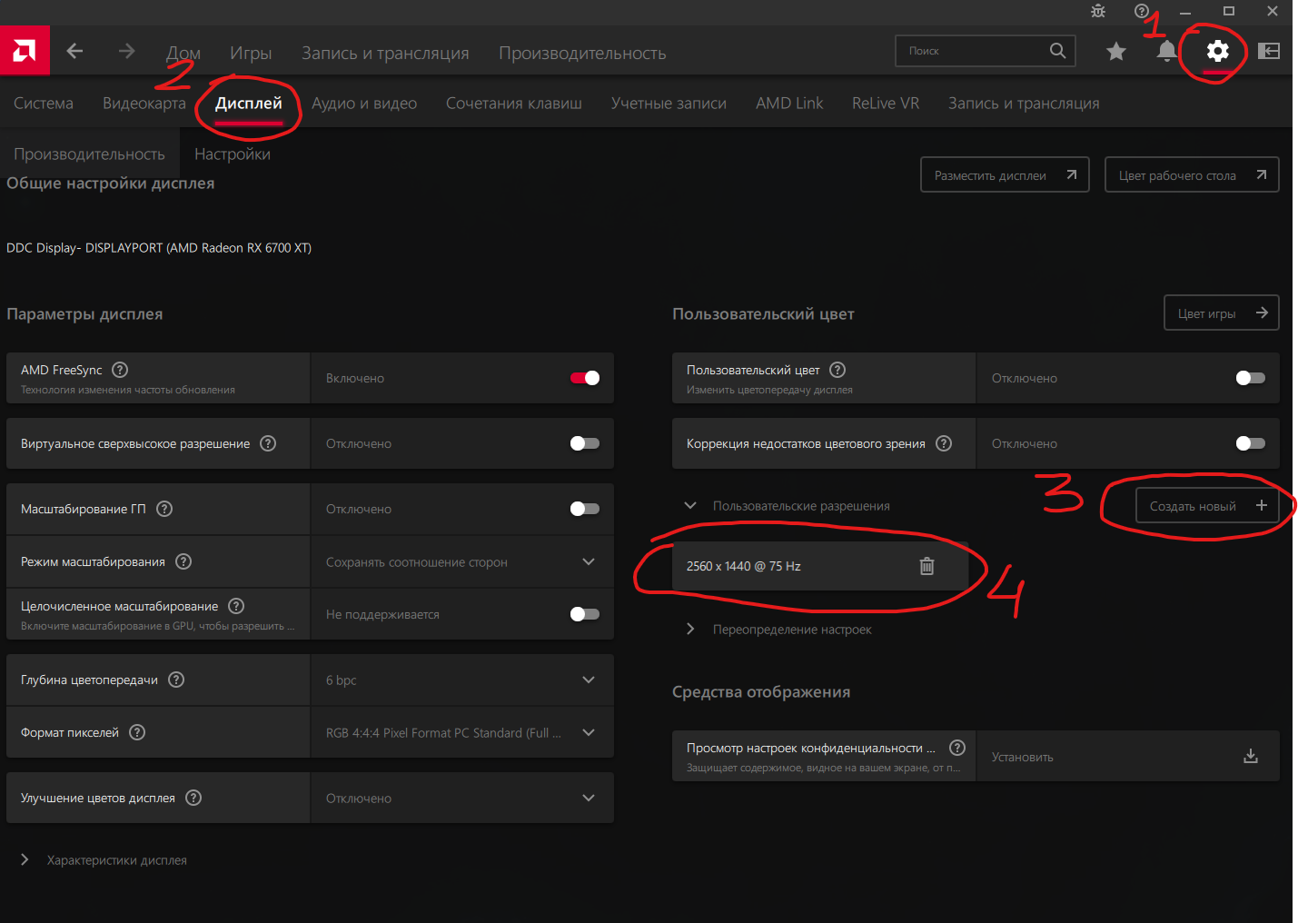 Итак, после установки драйвера владельцы мониторов 75, 144 герц и тд могут иметь такие проблемы. Если же у Вас монитор с герцовкой 60 или 120, 240 – то проблемы не будет. Решается этот вопрос очень просто – сначала выставляем пользовательское разрешение в драйвере Adrenalin: